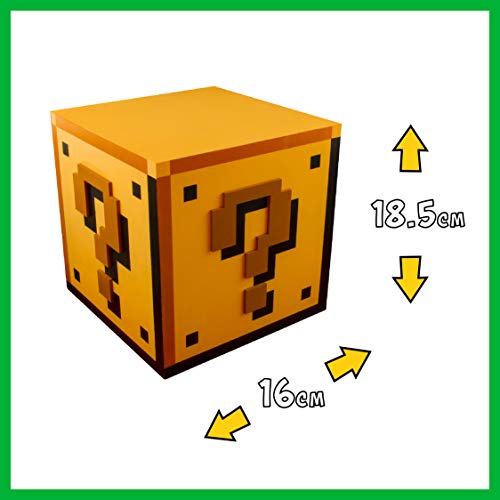 - OFFICIALLY LICENSED: Super Mario Question Block Night Light is an Officially Licensed Nintendo product. Push down on / off function. Measures approx. 16cm (W) x 16cm (L) x 18.5cm (H) including base.
