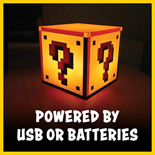 Details: Power-up your room with this Super Mario inspired Question Block Light. Designed like the iconic question block featured in the classic Super Mario series of video games, this distinctive night light is a perfect gift for any video game fan. With a pixilated design just like the original 2D games, the Question Block Light even features the official classic sounds from the game. The light is dual powered by either USB or batteries (batteries not included). A USB micro cable and full instruction leaflet are included with the product. The light has a touch on/off feature, so simply press down on the Question Block to activate. Characters such as Mario and Luigi have become instantly recognizable icons of popular culture, and are fans favorites among generations of gamers. The Question Block Light is an officially licensed Nintendo product. Recommended for ages 8 and above.