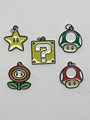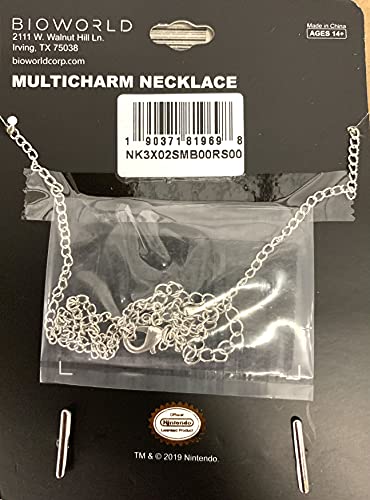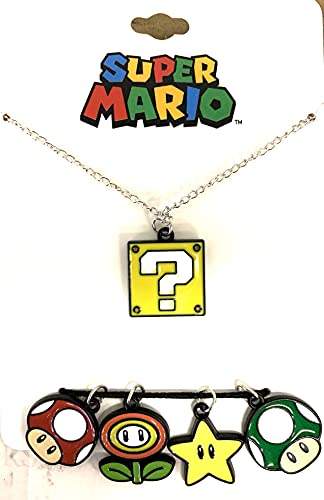 Details: Super Mario Multicharm Necklace. Comes with 5 different charms so you can change out every so often. Great iconic pieces from Super Mario game, Question Mark Coin Block, Red and Green 1-UP Mushrooms, Super Star and Fire Flower. Perfect for Nintendo or Super Mario fans.